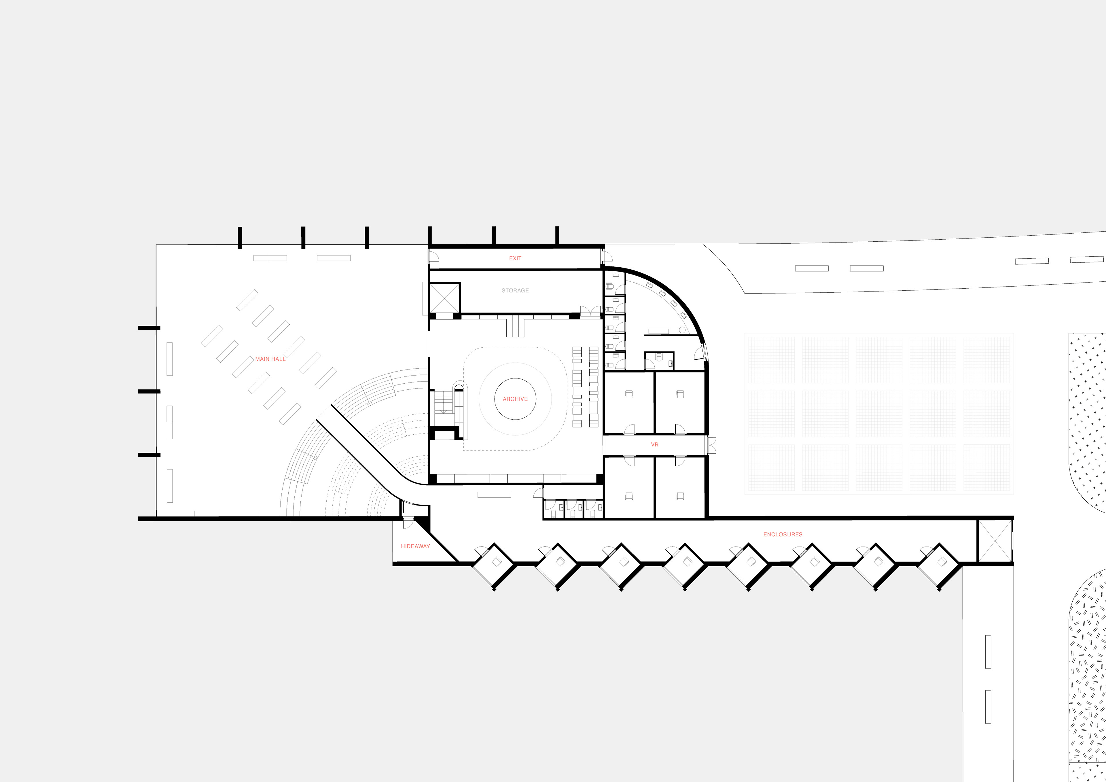 Enclosures är individuella rum som kompletterar större gemensamma utrymmen som Arkivet (Archive) och Huvudhallen (Main Hall).